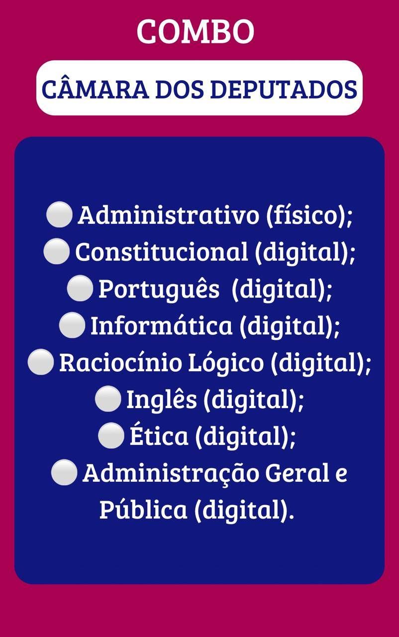 1 - Administrativo (físico); Constitucional (digital); Português (digital); Informática (digital); Raciocínio Lógico (digital); Inglês (digital); Ética (digital); Administração Geral e Pública (digital)
